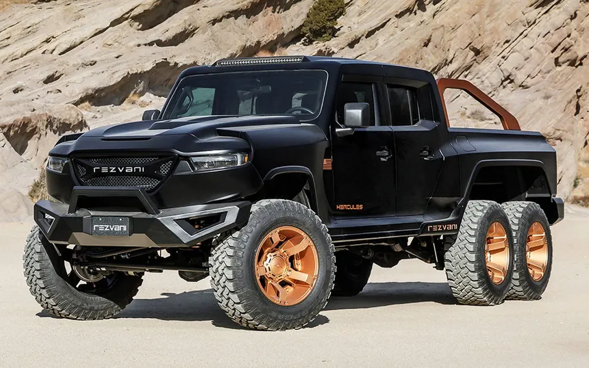 The Hercules 6×6 isn’t a Wrangler — it’s based on the Jeep Gladiator chassis, the four-door pickup. Six wheels, three axles, a 7.0-liter supercharged V8 with 1,300 horsepower in the top version. Starting price 195,000 dollars. Military Edition from 359,000. It’s the vehicle for fulfilling the fantasy of commanding a private convoy across the desert — even if your desert is probably the Whole Foods parking lot in Orange County.